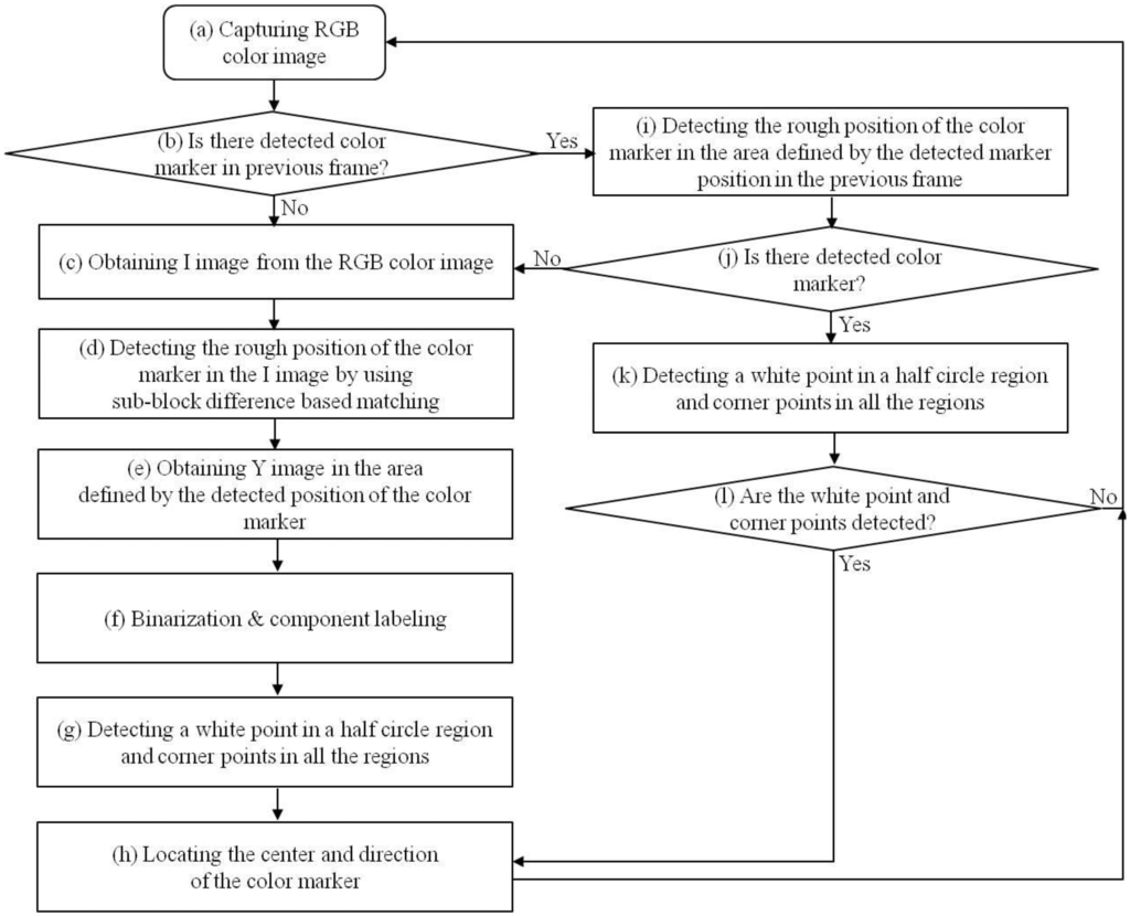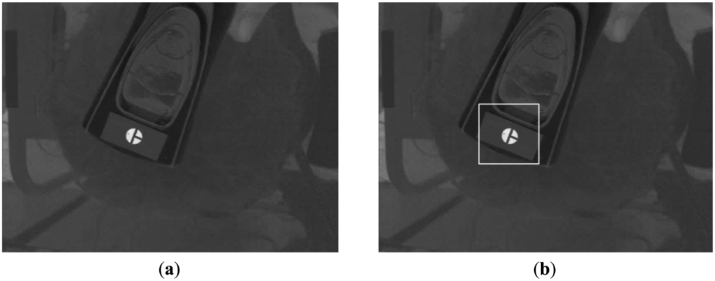 Using the I image shown in Figure 7a, we detect the marker using sub-block difference-based matching. This method is based on our past research [17].