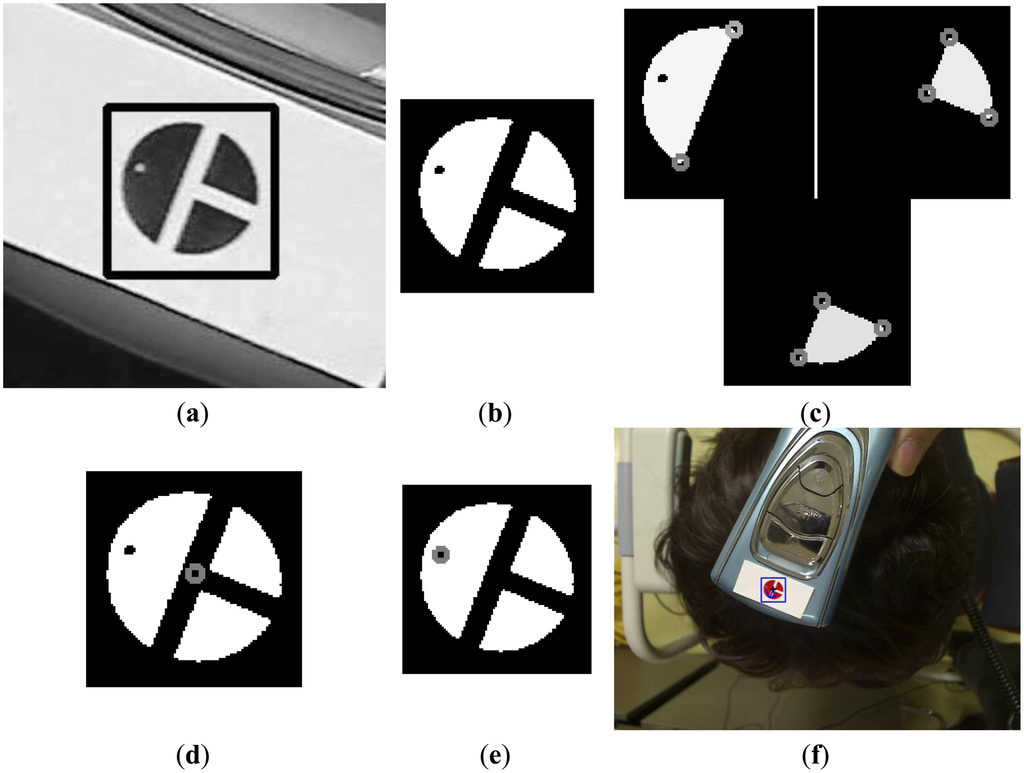 Figure 7b shows the detection of the marker by sub-block difference-based matching. Based on the detected area of the marker, the defined area of the Y image in the YIQ color space is obtained, as shown in Figure 9a. Here, we obtain only the Y image (not the Q image) from the RGB image in the defined area in order to increase processing speed. We perform the binarization and component labeling with the Y image to obtain the three regions shown in Figure 9b. With all three regions, we detect the corner points using a Harris corner detector [18], as shown in Figure 9c. Using the eight corner points, we can calculate the center of the marker, as shown in Figure 9d. Figure 9b shows the detection of the semi-circular region (Figure 5a) with the largest size; and inside the semi-circular area, the white pixel point (Figure 5a) is detected by binarization and component labeling in the area defined by the line, as shown in Figure 9e. The line is determined by the midpoints of the two lower corner points (the central image of Figure 9c) and the two upper corner points (the right-hand image of Figure 9c). Using the center (Figure 9d) and the white pixel point (Figure 9e) of the marker, we can calculate the direction of the diagnostic device (the arrow in Figure 9f). In addition, the center of the marker is determined to be the position of the diagnostic device (the cross-mark in Figure 9f).