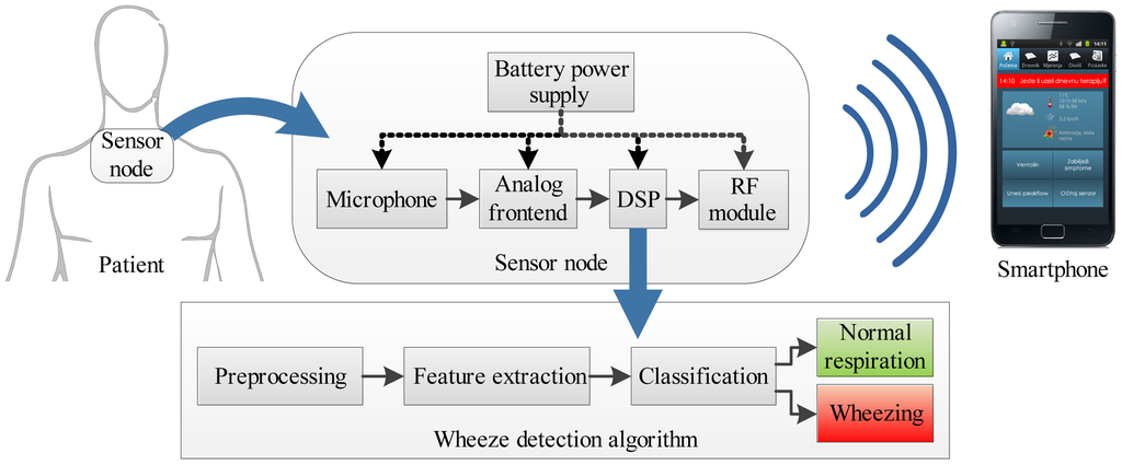 Recently, medical devices for the quantification of wheezing appeared on the market [2]. The devices, operating on-demand in handheld form and operating overnight in holter form, were found to be useful in clinical trials for the diagnosis of asthma in children during bronchial challenge tests [3], for the monitoring of the response to therapy [4] and for the diagnosing of nocturnal asthma [5]. Nevertheless, the current practice of long-term asthma management still lacks a low-cost and wearable sensing system to empower patients and caregivers to continuously track the intensity of symptoms on their own. Recently, the advancement of low-power electronic technologies and the advent of smartphones enabled the design of sensing systems consisting of unobtrusive wearable sensors, measuring physiological signals, and a smartphone, serving as a gateway and interface for feedback to the patient [6–9].