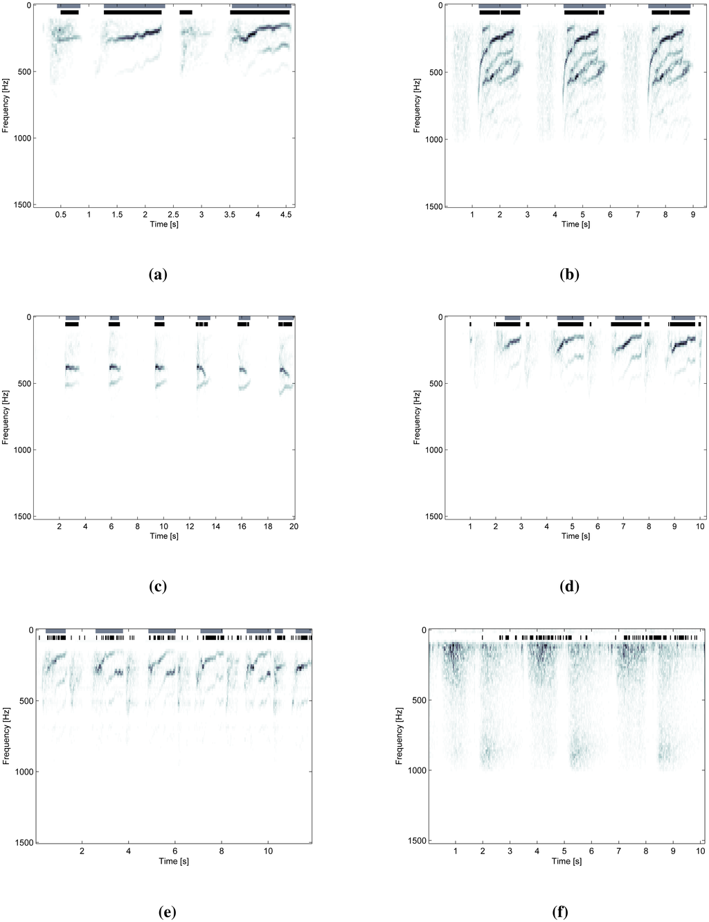 Figure 10 shows examples of the classification results overlaid onto signal spectrograms. Gray markings represent referent intervals of wheezing annotated by an expert (referent positives), while black markings are signal segments classified as wheezing (classified as positive). Figure 10a–d shows examples of accurate classification by all four algorithms suitable for wheeze duration tracking. On the other hand, Figure 10e shows an example of a less successful classification by Algorithm 3, containing a high number of false negative signal segments. Similarly, Figure 10f shows an example containing a high number of false positive signal segments obtained on normal a respiratory signal by Algorithm 4.