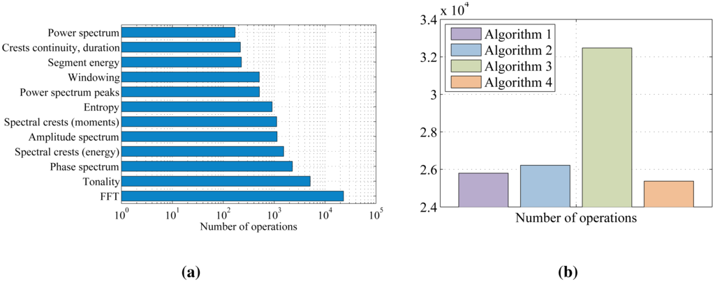 The results of experimental DSP implementation shown in Table 10 and the a priori analysis of the computational complexity shown in Figure 11b agree on the relative relations between the total execution durations of all the algorithms. The differences in the results obtained in the per-feature profiling (Figures 11a and 12) clearly indicate the benefits of the exploitation of DSP's architectural features, which accelerate numerically intensive operations (the FFT coprocessor and dual MAC unit).
