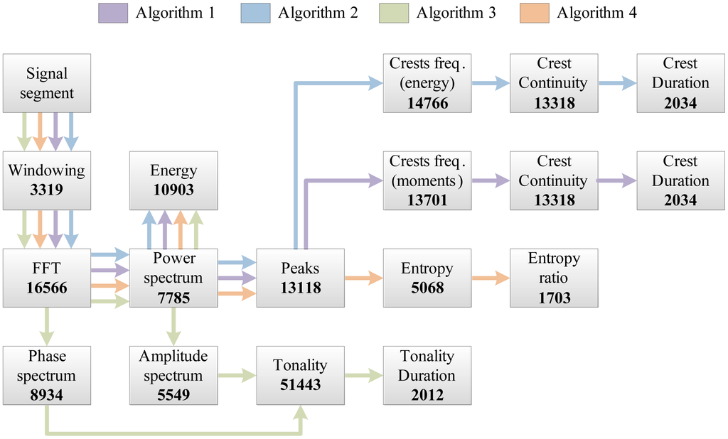 According to the experimental results, Algorithm 4 (peak entropy) features the shortest overall execution duration, with the power spectrum peak detection program block being its bottleneck. Algorithms 1 and 2 are slower in execution than Algorithm 4, for 21% and 28%, respectively. They differ only in crest modeling blocks (labeled as “Crest freq.” in Figure 12), with the model based on crest energy being about 7% slower. Tonality tracking tends to be the slowest (a 65% longer execution than Algorithm 4). Its main bottleneck is the numerically intensive calculation of tonality. Furthermore, additional preprocessing blocks (the calculation of the amplitude and phase spectrum) contribute to its total execution time.