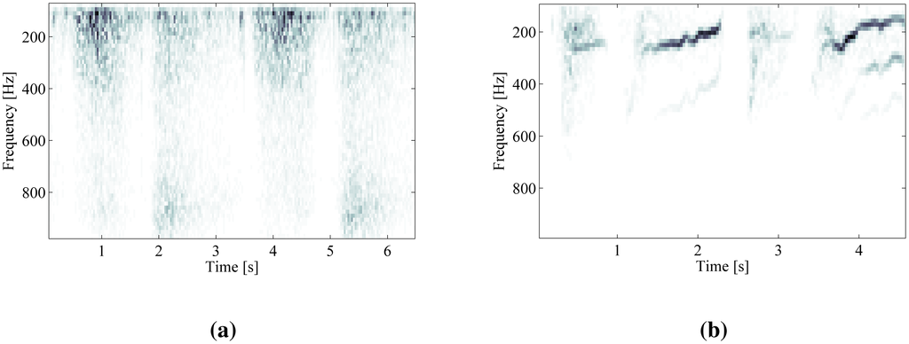 A comparison of STFT time-frequency decompositions of normal respiratory sounds and respiratory sounds containing wheezing is shown in Figure 2. The harmonic components originating from wheezing appear as continuous frequency peaks elevated against the noise of normal respiration. The peaks of wheezing are localized along the frequency axis and spread in the direction of time axis.