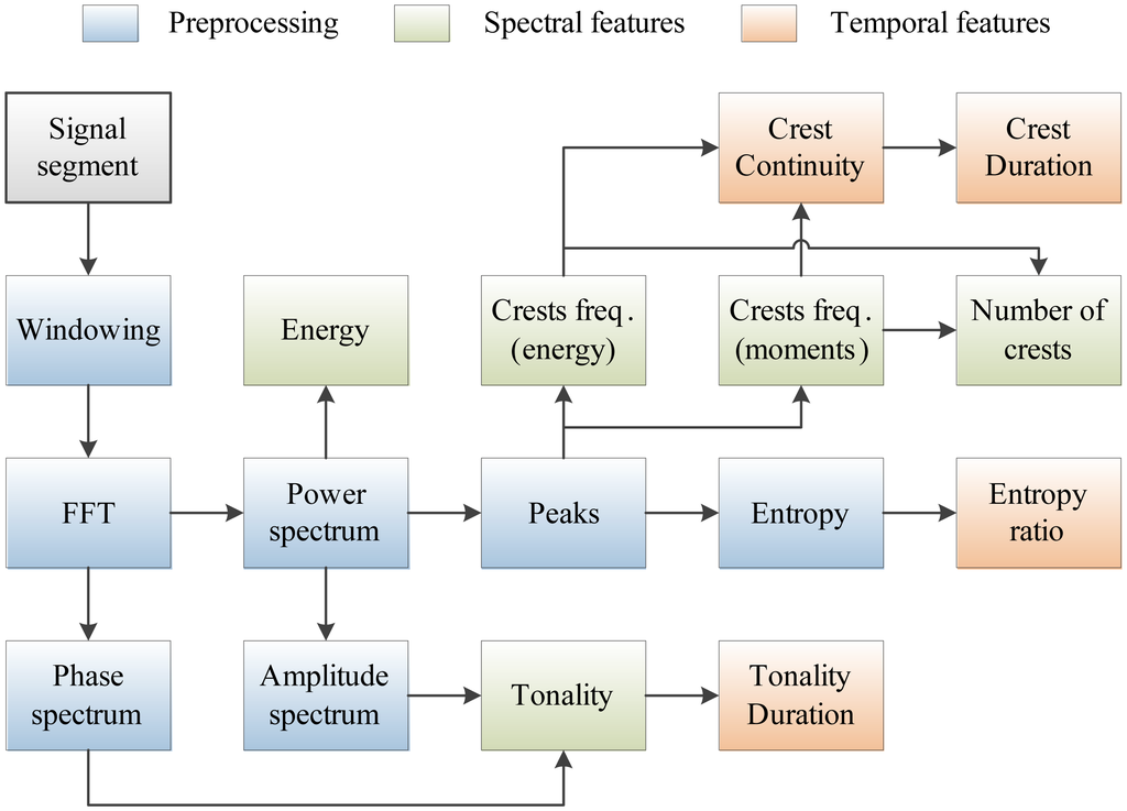 First, the existence of spectral crests is determined by modeling the surroundings of the power spectrum peaks, either using statistical moments as in Algorithm 1 (see Equation (17)), or as in Algorithm 2, using energy (see Equation (19)). Extracted crests are counted in order to check that feature Nc satisfies 1< Nc < Ccrests. Next, the temporal features of crests are evaluated.