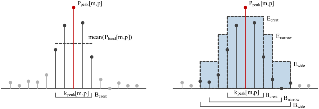The first approach to spectral crest modeling is based on the first- and second-order statistical moments (mean, standard deviation) describing the distribution of the magnitudes of the subset of power spectrum components, Pband[m, p], forming a band around the central frequency, kpeak[m, p], of the each of the Np power spectrum peaks (see Equation (16)). Bandwidth Bcrest (see Figure 4, left) is chosen during algorithm training.