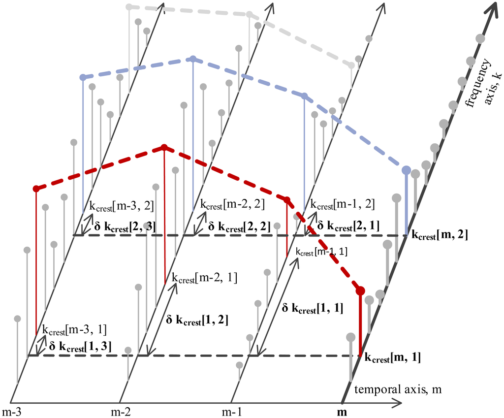 The first feature is the continuity of the spectral crests in the time-frequency plane. Continuity is described by extracting the deviations of each crest's peak frequency, kcrest[m,c], along the temporal axis, as shown in Figure 5. Deviations δkcrest[1…Mcont,c] are extracted pairwise between the current signal segment, m, and each of its Mcont preceding neighbor segments, as shown in Equation (20). The second temporal feature is the duration, δmcrest [c], of each continuous spectral crest.