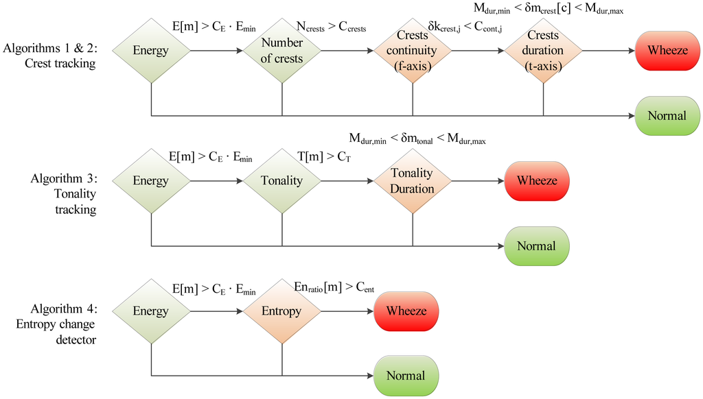 A total of four wheeze detection algorithms are developed, by organizing subsets of features from Section 4.2 into decision trees, shown in Figure 6: two crest tracking algorithms sharing the analogous decision trees (labeled Algorithms 1 and 2), a tonality tracking algorithm (Algorithm 3) and an entropy change detector (Algorithm 4). All decision trees share the same root, evaluating the segment energy, in order to decide whether the segment is part of a respiratory cycle or an inter-respiratory pause, enabling early termination. The remaining branches are algorithm-specific. The classification operates segment-wise, assigning each signal segment to one of two classes: “non-wheezing”, or “wheezing”.