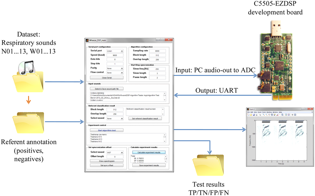 Thus, the contributions of this article are: (a) the review of STFT-based wheeze detection algorithms; (b) the analysis of the a priori computational complexity of the representative algorithms and their DSP implementation; (c) the test environment for the automated assessment of the classification accuracies of the algorithms running on the DSP; and (d) the analysis of the relation between the accuracies and execution times, for two scenarios of different detection fidelities: (1) the detection of the occurrence (event) of wheezing; and (2) the tracking of the wheeze duration.