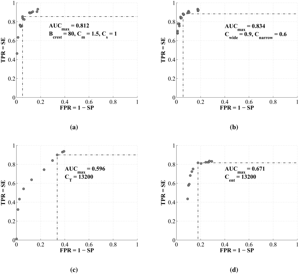 The receiver operating curves averaged through all N = 26 iterations of leave-one-out training of each of four algorithms are compared in Figure 9. The maximal areas under the curves, AUCmax, and the associated set of trained classification parameters by which they are obtained, are shown on each graph.