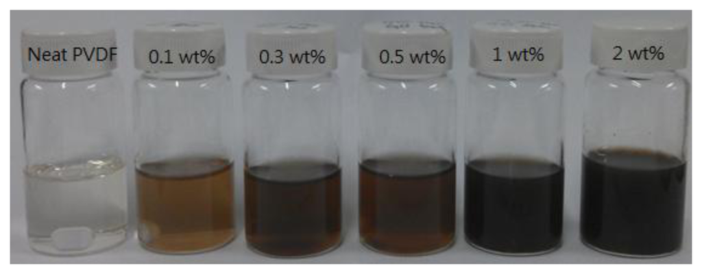 By the processes described in Sections 2.1–2.3, one can determine the best film-deposition and crystallization conditions for the PVDF film. After that, the GO doping of the PVDF is performed. The single-layer graphene oxide powder is produced by Legend Star International (Taipei, Taiwan). Firstly, GO powder was dispersed in DMF and stirred for 20 h at 60 °C till the GO powder was completely dispersed. Secondly, PVDF powder was added into the solution and stirred for 4 h at 60 °C till the PVDF powder was dispersed completely. Finally, the solution was placed in an ultrasonic cleaner and oscillated for 3 h till completely dispersed. Five different concentrations of GO-doping were prepared; the recipes and the resulting solutions are shown in Table 2 and Figure 1, respectively. Like in Sections 2.2 and 2.3, the GO-doped PVDF film is deposited on a flexible ITO/PET substrate by spin-coating and the β-phase crystallization modified by annealing.