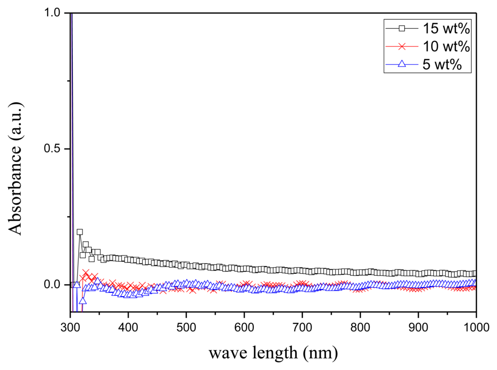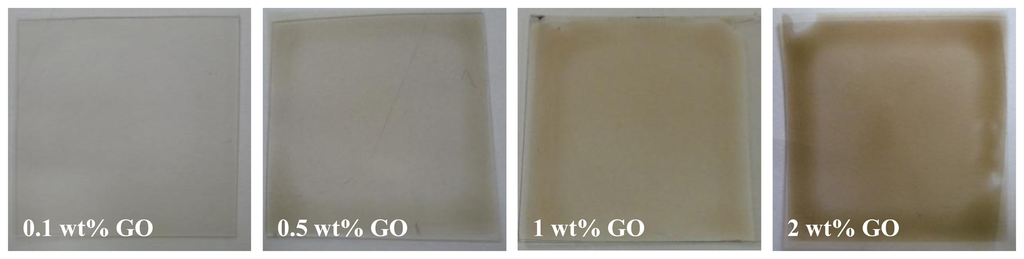 On the other hand, the film becomes less transparent (Figure 10) as the concentration of GO increases. Furthermore, the film around the border of the substrate is much thicker than that in the central area. The GO-doping will make the substrate warp and, even worse, make the PVDF film peel off.