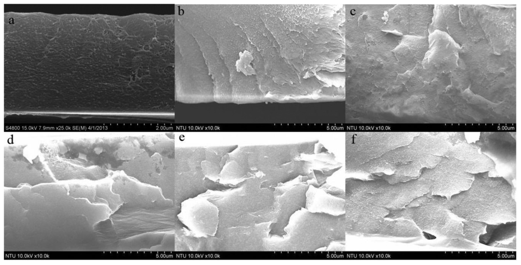 The resulting GO-doped PVDF film on ITO/PET substrate is transparent and flexible and thus easily bent with the fingers (Figure 11). Figure 12 shows SEM pictures of the cross sections of PVDF films with different wt% GO-doping. The cross-section of neat PVDF film (Figure 12a), is rather flat and smooth, while those of the other nanocomposite GO-doped PVDF show that most of the GO is fully exfoliated and clearly well dispersed. Furthermore, GO is randomly dispersed within the matrix, which is important for improving the mechanical properties of nanocomposites and increasing the pyroelectricity of PVDF. Consequently, the melt mixing method is appropriate for obtaining a homogeneous distribution of GO nanosheets within the PVDF polymer. In summary, the GO-doping will increase the thickness of film spin-coating, make the film less transparent, warp the substrate, and in the worst case, even make the PVDF film peel off, if the GO-doping concentration is too high. The melt mixing method is appropriate to obtain a homogeneous distribution of GO nanosheets within the PVDF polymer.