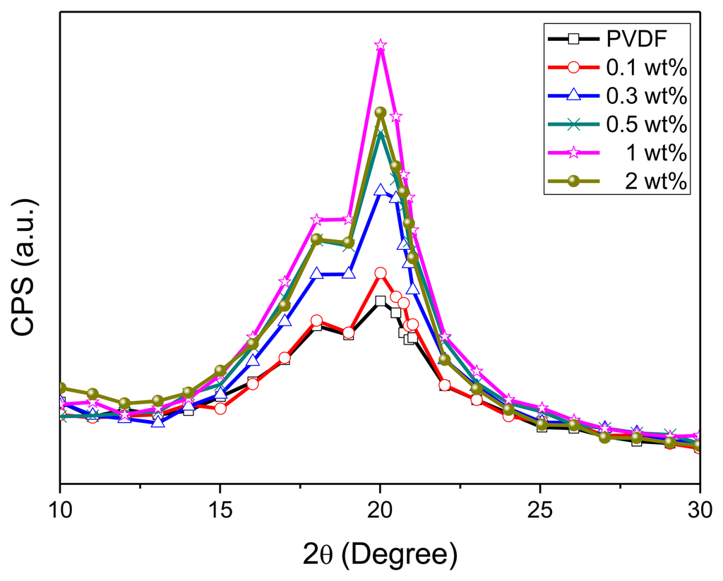 Following the spin-coating process, the annealing process at 80 °C for 2 h is to modify the β-phase crystallization of GO-doped PVDF. From the XRD analysis (Figure 13), one can find the strongest peak at 2θ = 20.8° (the β-phase crystallization) with 1 wt% GO-doping, while the neat PVDF reveals the weakest peak.