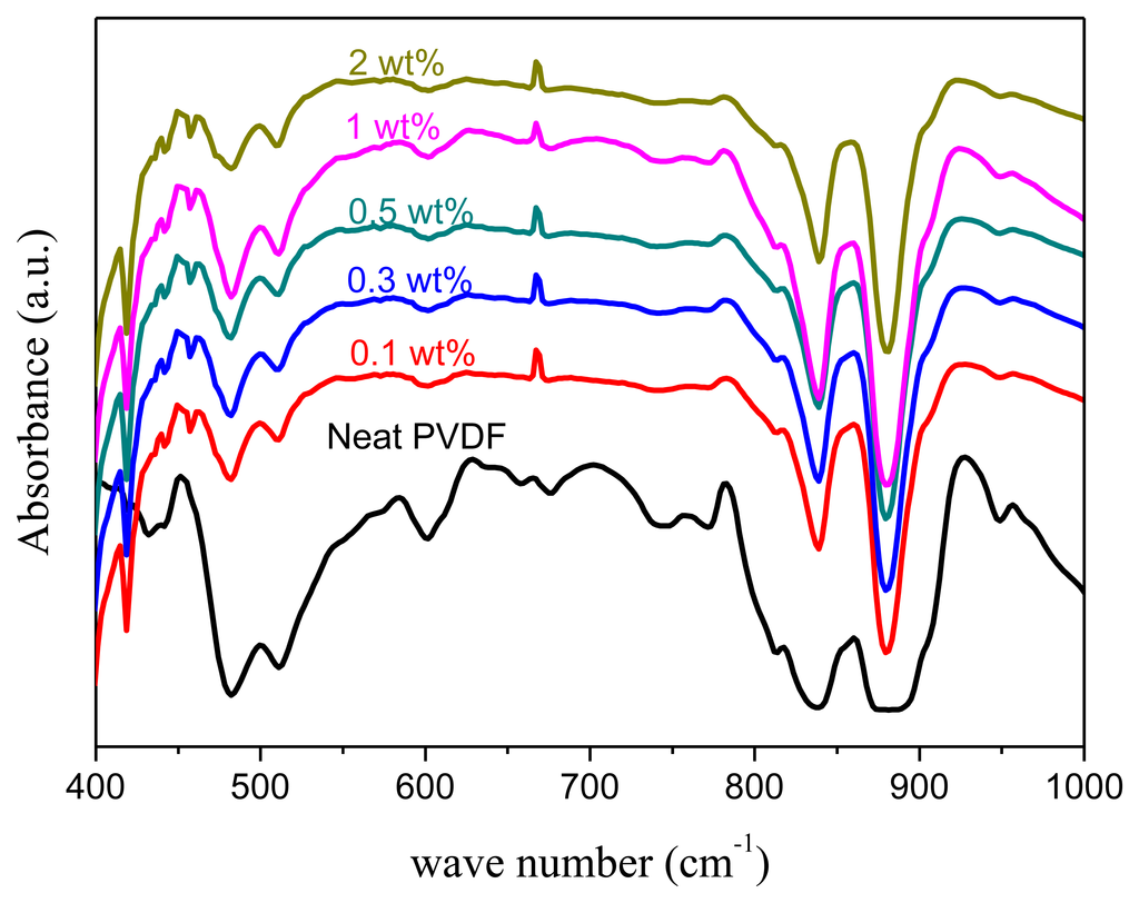 The formation of β-phase in PVDF nanocomposite film can be confirmed by the presence of specific transmittance bands in the FTIR spectra. Figure 14 shows the FTIR spectra of GO-doped PVDF. One can find that GO-doping will change the crystallinity of PVDF, but the peak at wave number 839 cm−1 still exists and the best doping concentration is 1 wt%, because the wave number at 839 cm−1 is the strongest absorbance peak of the β-phase and 1 wt% doping concentration reveals the strongest β-phase peak. The formation of β-phase in PVDF nanocomposites is attributed to the strong and specific interactions between the carbonyl groups found in GO and the CF2 segments of the PVDF polymer [21]. In summary, GO-doping significantly benefits the β-phase crystallization of PVDF nanocomposite, and a complete β-phase can be achieved with only 1 wt% GO concentration, which is much less than other literature reports that require high concentrations of CNTs, graphene derivatives, or clay particles. XRD analysis is in good agreement with FTIR analysis.