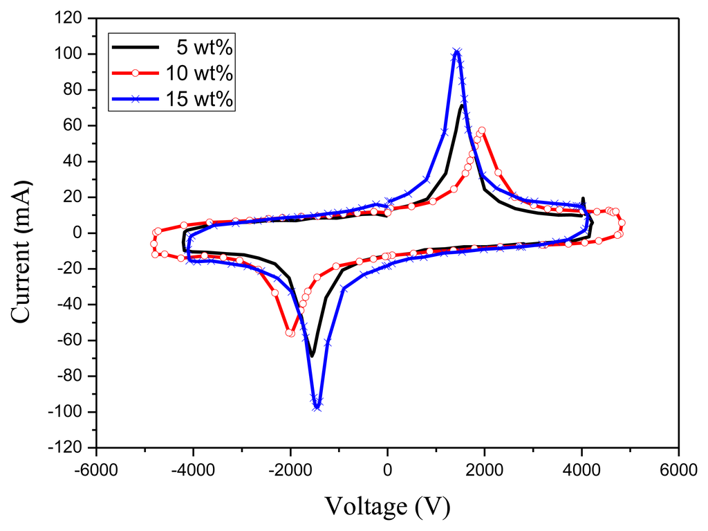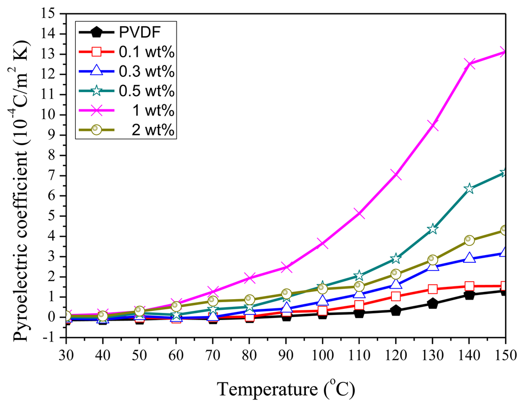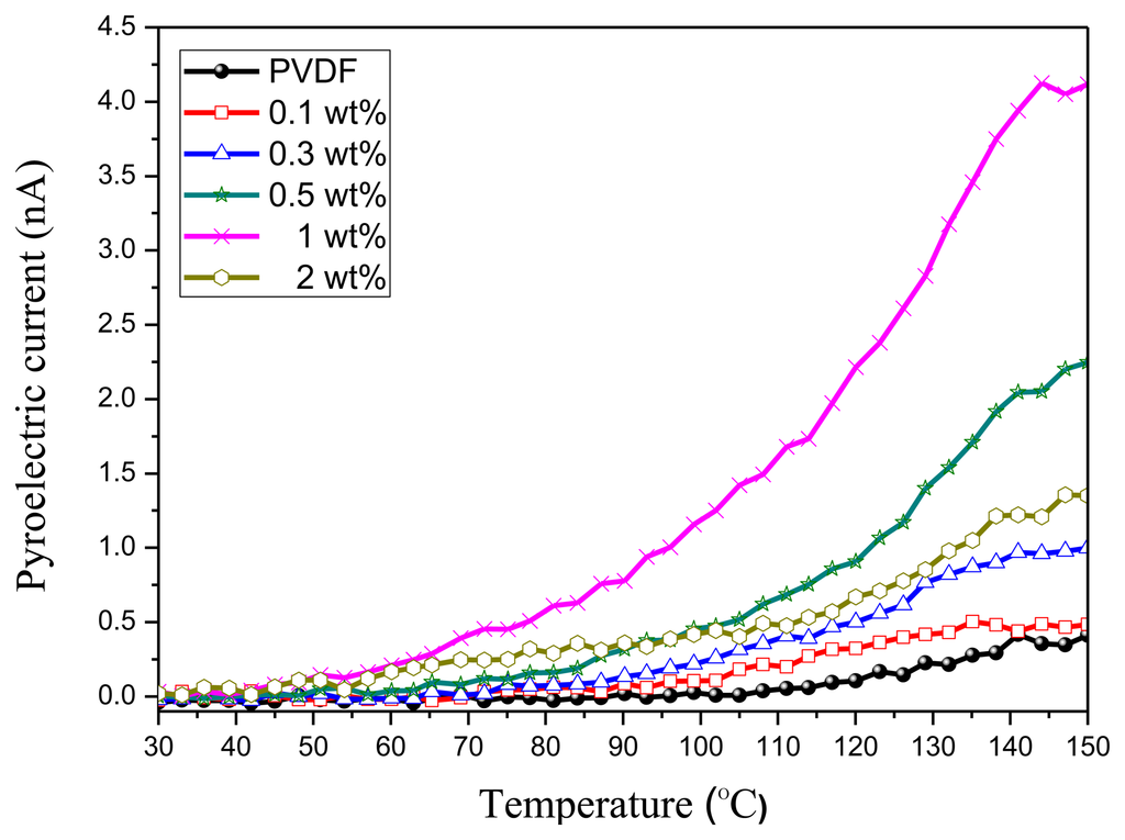 As shown in Figure 15, the largest pyroelectric coefficient occurs when doping 1 wt% GO, a result that coincides with the XRD and FTIR analyses. GO-doping can effectively improve the pyroelectric properties of PVDF. The pyroelectric current (Figure 16) of the case of 1 wt% GO-doping is three times the case of 2 wt% GO-doping and ten times the case without GO-doping. However, too high a GO-doping will cause current leakage. It had been found that high doping concentrations will cause a decreased figure of merit (FV) because there will be a significant increase in the dielectric constant and thus the pyroelectric signal decreases.
