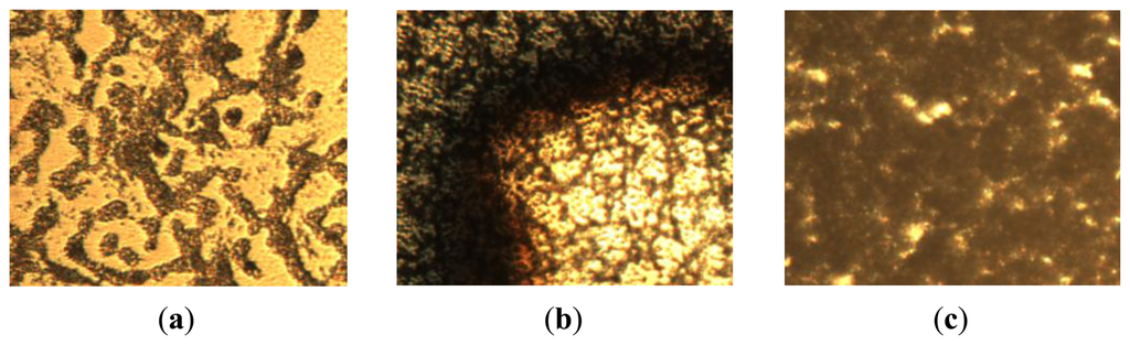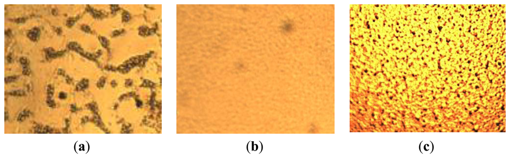 The main disadvantage of the sol-gel method is the film porosity. As shown in Figure 2, the optical microscope pictures (400×) of PVDF films produced by solvent-baking in the atmosphere show many void fractions (the dark areas), which are formed during the solvent baking process. The porosity is harmful to film formation and increases the film roughness. No matter what the PVDF concentration or the spinning speed are, the porosity cannot be improved. Therefore, we tried to bake out the solvent under vacuum (under 10 mTorr) and thus found that the porosity can effectively be eliminated (Figure 3). For the case of 10 wt% PVDF, there is almost no porosity after solvent-baking under vacuum, while small void fractions are still seen in the case of 5 wt% and 15 wt% PVDF. This phenomenon is attributed to the fact that for the case of 5 wt% PVDF, parts of the solvent evaporate during the spin-coating step, while for the case of 15 wt%, the high concentration of PVDF prevents the venting of the air bubbles in the solvent during the solvent baking under vacuum. In summary, the film porosity can be effectively eliminated by s solvent-baking step performed under vacuum accompanied by the best PVDF concentration. Therefore, we determined the 10 wt% PVDF to be the best and adopted solvent-baking under vacuum in this work.