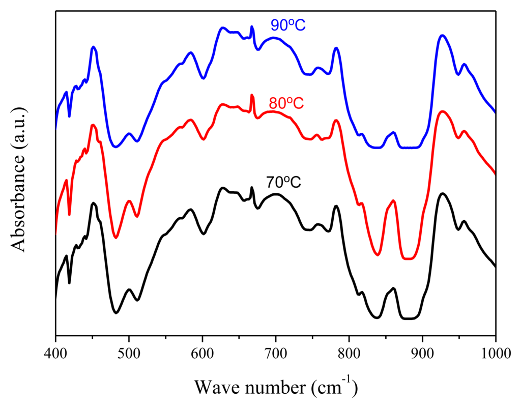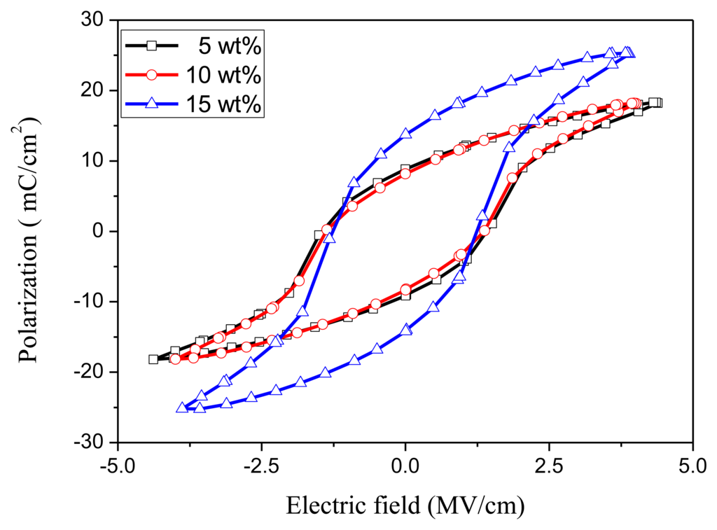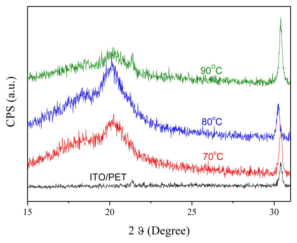 An annealing process is required to modify the β-phase crystallization of PVDF after the film deposition process. Figure 4 shows the XRD analysis of the 10 wt% PVDF film under the annealing temperatures of 70 °C, 80 °C, and 90 °C for 2 h. The crystallization of PVDF is mainly β-phase (2θ = 20.7°) and α-phase (2θ = 17.9°) while the peak at 2θ = 30.4° is the ITO/PET substrate. One can find that the best annealing temperature for β-phase crystallization is 80 °C. Figure 5 shows the FTIR analysis of the 10 wt% PVDF film after annealing at temperatures of 70 °C, 80 °C, and 90 °C for 2 h. The peaks at the wave numbers 490, 511, 761 and 983 cm−1 correspond to the α-phase while those of 440, 477 and 840 cm−1 correspond to the β-phase [18–20]. Focusing on the peak at 840 cm−1 that has the highest absorbance in the β-phase, 80 °C is the best annealing temperature for the β-phase crystallization of PVDF. However, focusing on the peak (761 cm−1) that has the highest absorbance in the α-phase, the annealing temperature does not affect the α-phase crystallization. From the UV-Vis analysis (Figure 6), one can find that there is no special correlation of the absorbance of PVDF to a specific wavelength and the higher concentration of PVDF may raise the absorbance a little bit. From the electrical hysteresis loop (Figure 7), one can find that the case of 15 wt% PVDF shows the highest remnant polarization while those of the other two cases (5 wt% and 10 wt%) are similar. From the C-V curves of Figure 8, one can verify the resulting PVDF films indeed possess ferroelectricity. In summary, the best annealing temperature for the β-phase crystallization of PVDF is 80 °C, which is adopted in the subsequent process of PVDF film GO-doping. Higher PVDF concentrations will benefit remnant polarization but, as mentioned in Section 3.1, this damages the film quality.