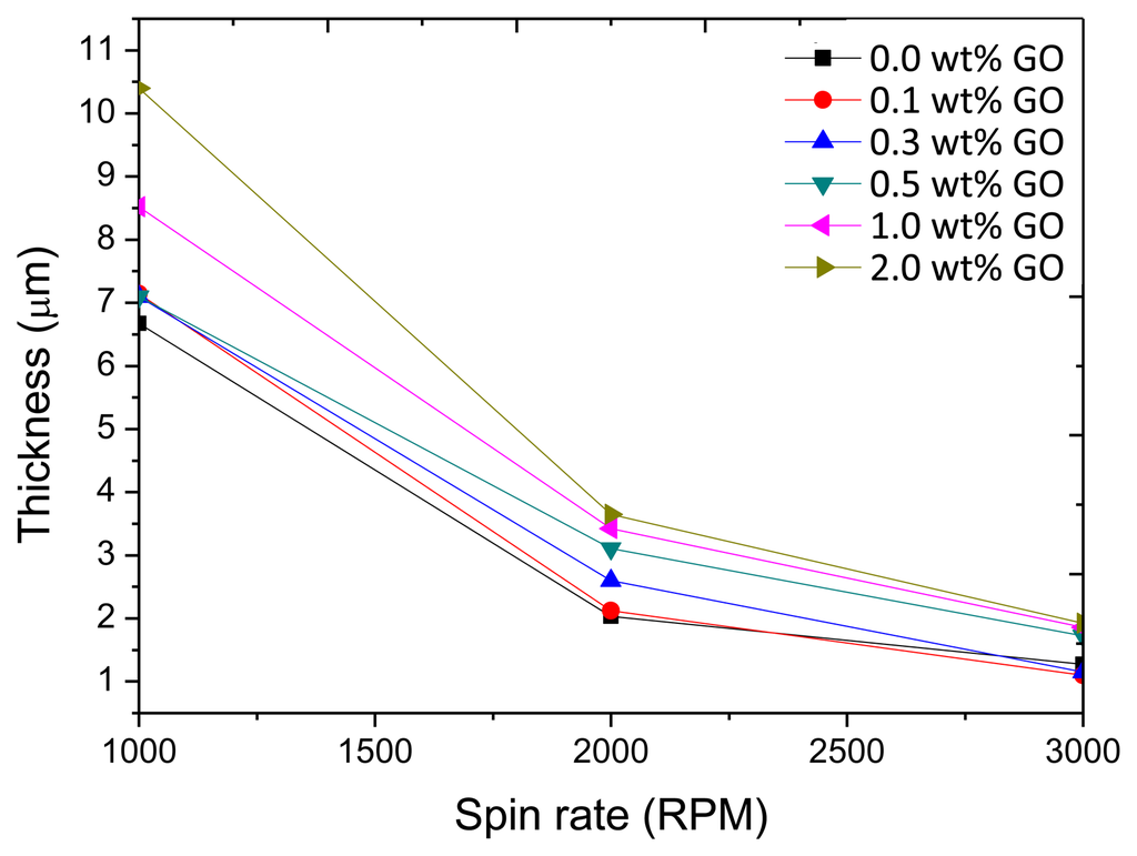 As shown in Figure 9, the GO doping also affects the spin-coating film thickness, especially for lower spin rates (1,000 rpm), and the higher the GO-doping concentration, the thicker the film.