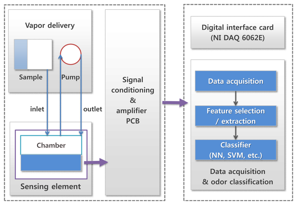 An electronic nose consists of a sensor array for chemical detection, which is made of polymer carbon composite materials, and a classifier based on various pattern recognition techniques. Hence, the sensitivity of a sensor array and the design of a classifier are crucial factors for the improvement of electronic noses. There are several types of sensor arrays for electronic noses [10–15]. Among them, conducting polymer composites, intrinsically conducting polymer and metal oxides are most commonly used for sensing materials in conductivity sensors. Once volatile organic compounds (VOC) are adsorbed on the sensor surface, a specific response is obtained as a numerical variable by an electronic interface.