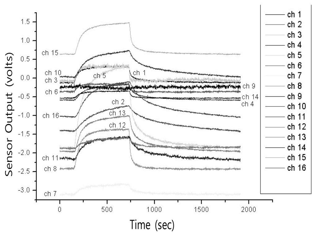 The sensor array used in our system was implemented by dispensing a CB polymer composite-solvent solution in a micromachined gas sensor array chip [15]. While the polymer composite has some drawbacks such as sensor drift, limited sensor life, or sensitivity to temperature and humidity it offers many advantages over other materials when used as gas sensor, e.g., the wide range of polymetric materials, inexpensiveness, stable operation at room temperature, and less power consumption, etc. [10] The sensor array consists of 16 separate sensors with an interdigitated electrode, microheater, and micromachined membrane in each channel for further temperature-controlled measurement applications (Table 1). The resistance change of each polymer composite film was monitored in response to the incorporation of chemical vapor. The resistance change of polymer composite film was amplified by 20 times and recorded every 0.1 s (Figure 3). Measurement consisted of three steps of stabilization (30 s), exposure (60 s), and purge (110 s). It was performed after the sensor array was placed into the chamber and and the signal of resistance was stabilized. Then, the flow control unit in our system allows the vapors to flow in at desired concentration during about 60 s and afterward flushes the remainder by air flow for about 110 s [37]. The measured data are collected in PC using data acquisition (DAQ) board DAQ6062E and LabVIEW (National Instrumentation, USA). The voltage-divider operated in the range from -10 V to +10 V and gains of 16 identical amplifiers were set to 10 (output/input voltage) for maximum DAQ resolution [15].