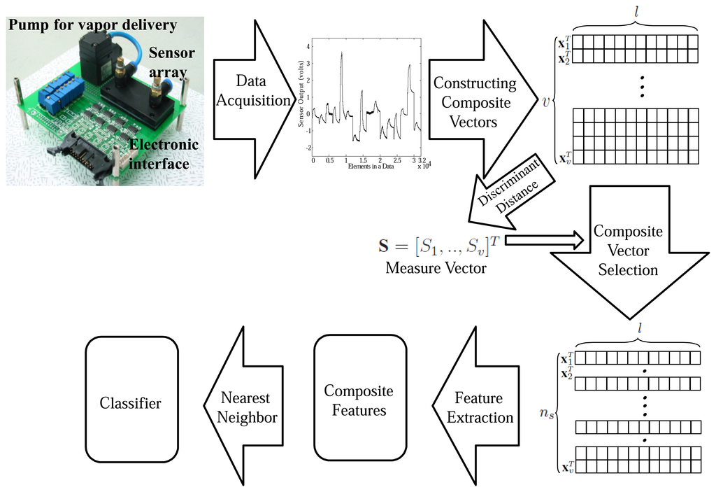 In this paper, we propose a method to select the composite vectors which contain informative variables in an electronic nose data sample measured by a sensor array. We measure the amount of discriminative information that each composite vector has, based on the discriminant distance [35] for each composite vector and rank nCf composite vectors in descending order according to its discriminant score. The informative composite vectors are distinguished before the process of feature extraction, and then the composite features to be used for the classifier are extracted from the only selected composite vectors. There are potential benefits in employing this selection process such as reduction in computation, storage and processing time in addition to prediction performance improvement. In the process of extracting composite features, the computational effort increases in the order of υ2 as the number of composite vectors (υ) increases. This implies that the computational complexity can be significantly reduced by the proposed method. By using a classifier in an electronic nose with the extracted composite features, we design the robust electronic nose system to noisy environments (Figure 1). The experimental results show that the proposed method gives very good classification results even in a noisy environment.