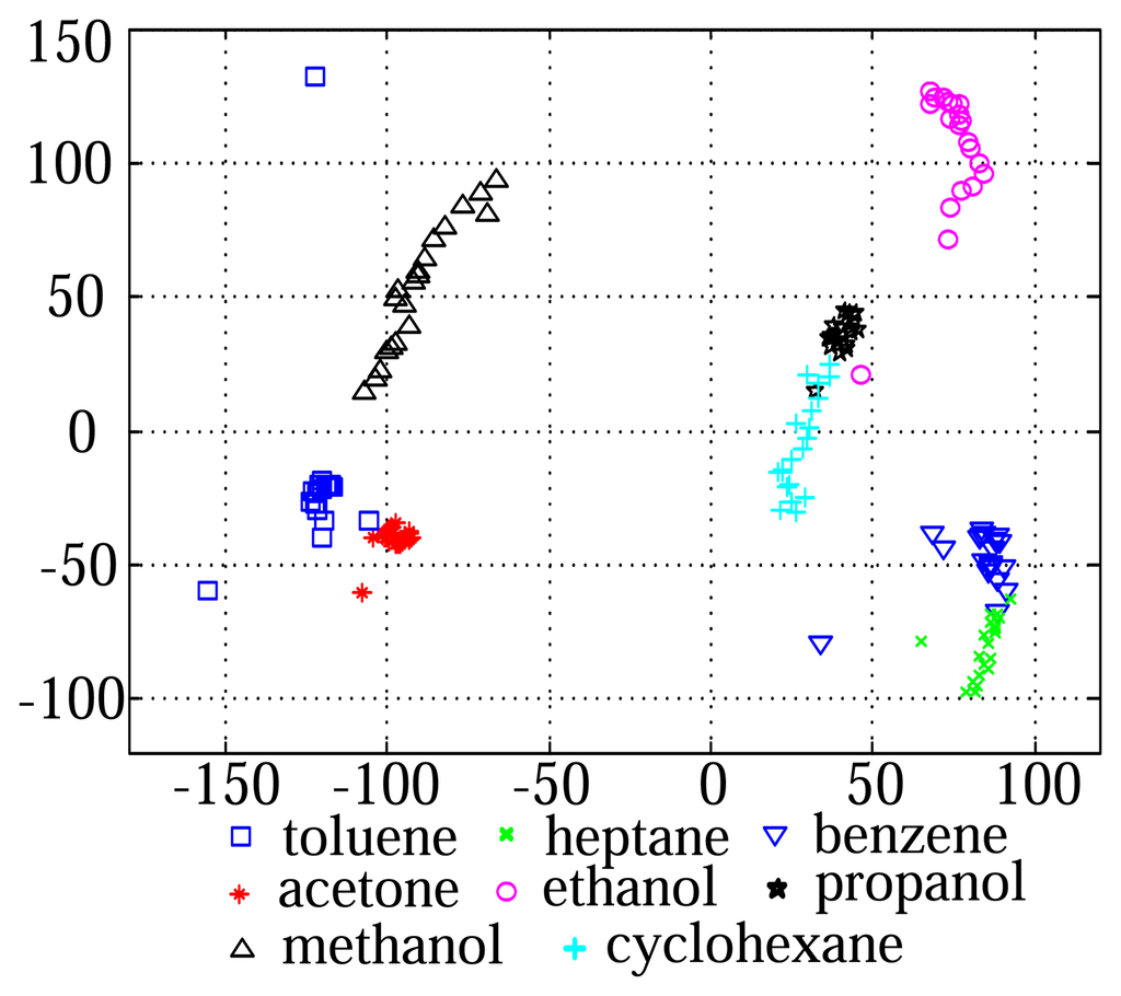 The VOC measurement data consists of 8 classes, which are acetone, benzene, cyclo-hexane, ethanol, heptane, methanol, propanol, and toluene [15]. For each class, we obtained 20 samples, and thus the total data set contains 160 samples. Figure 5 shows the distribution of the data samples in the subspace consisted of two principal component axes. The e-nose sensor used in this experiment measures vapors with a speed of 10 Hz, which corresponds to a sampling rate of 2,000 points per 200 s. Each data sample was measured through 16 channel over 2,000 time points and was represented as a 16 × 2,000 matrix. Then, the raw data was transformed into the 32,000-dimensional vector by using the lexicographic ordering operator for feature extraction (Figure 2).