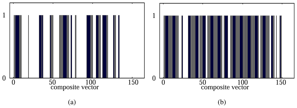 When setting l and s as 400 and 200, respectively, the total 159 composite vectors can be generated from a 32,000-dimensional data sample. We measured the discriminant scores of each composite vector by using the proposed method. Out of the total 159 composite vectors, we represented the composite vectors with top 60 and 120 scores as ‘1’ and the rest as ‘0’ (Figure 6). In Figure 6, we can see that the ‘stabilization’ and ‘purge’ periods contain the discriminative information for odor classification as well together with the ‘exposure’ period.