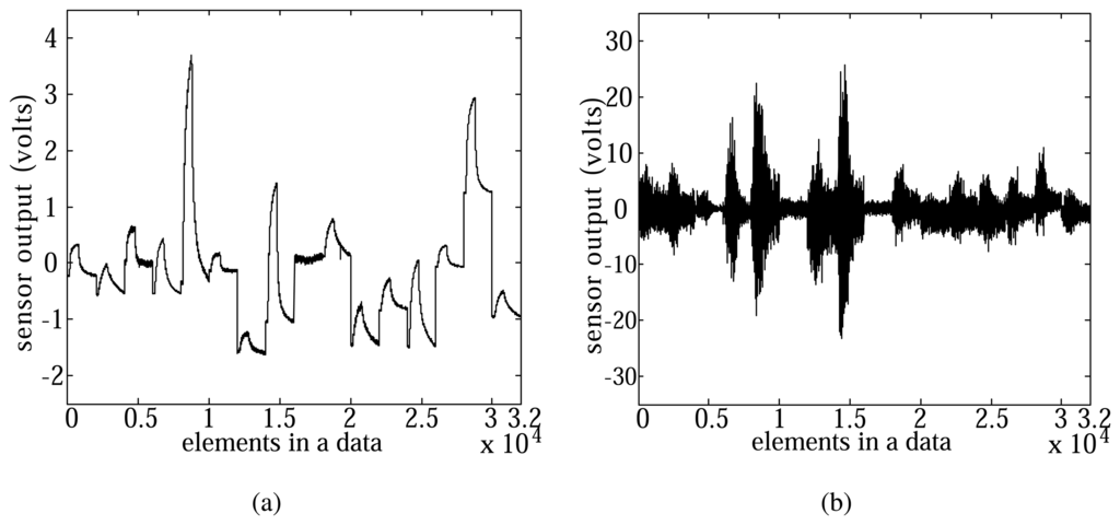 Composite vectors can be defined in various ways depending on the shape of a window. The data acquired from a sensor array is stored in an n-dimensional vector, and a composite vector xi ϵ ℝ l consists of l(l < n) primitive variables. Composite vectors are generated by shifting a window as much as s, which is usually smaller than the length of a composite vector, and thus composite vectors overlap with each other, as shown in Figure 2. The correlation between neighboring variables can be better utilized in the use of the covariance of composite vectors. The number of composite vectors υ is , where └ · ┘ is the floor operator, which gives the largest integer value that is not greater than the value inside the operator. Then, the k-th data sample is represented by X(k) = [x1(k),..,xυ(k)]T ϵ ℝ υ×l, which is a set of composite vectors. The final composite features for classification are extracted by using the covariance of these composite vectors [36].