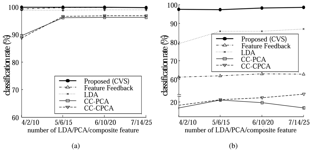 We compared the classification performance of the proposed method (CVS) with that of the LDA method [26], the FF (Feature Feedback) method [38], the CC-PCA (Component Correction by PCA) method [39], and CC-CPCA (Component Correction by Common PCA) method [22]. We applied PCA after CC-PCA and CC-CPCA, which slightly increased their classification rates. Each method was evaluated using an 8-fold cross validation strategy [40]. In this scheme, the data is first randomly partitioned into 8 equally sized folds. Then, 8 iterations of training and testing are performed, within each of which a different fold of the data (20 data samples) is used for testing, while the remaining 7 folds (140 data samples) are used for training. The nearest neighbor rule was used as a classifier and the l2 nor was used to measure the distance between two samples. We repeated this test 8 times and computed the average classification rate. All the data samples are normalized using the mean and the variance of the training set.