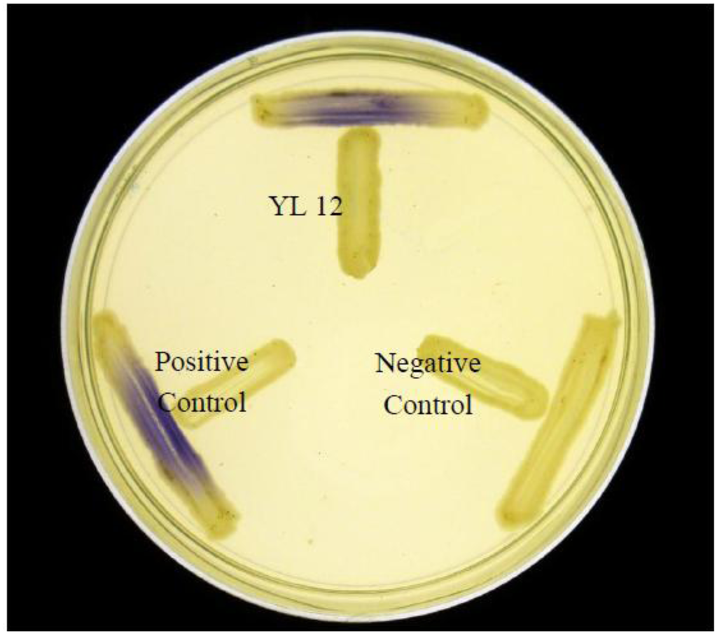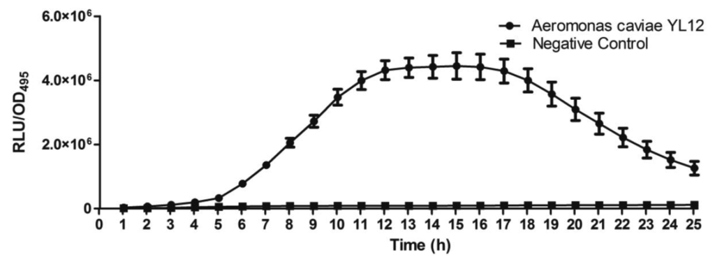 Approximately 80 strains of bacteria were isolated from the compost suspension and all of the strains were preliminarily screened for AHLs production by cross-streaking with C. violaceum CV026 as biosensor. C. violaceum CV026 is an AHL biosensor that was subjected to mini-Tn5 transposon mutagenesis which result in a mutation that is defective in production of AHL but retain the capability of producing violacein, a water-insoluble purple pigment, when exogenous short chain AHLs are detected []. In the cross-streaking experiment conducted, strain YL12 triggered CV026 violacein production (Figure 1), which suggests that YL12 produces diffusible short chain AHLs. In order to confirm QS activity of YL12, further QS analysis in the form of bioluminescent reporter assay was conducted and YL12 demonstrated a cell density-dependent induction of bioluminescence (Figure 2).