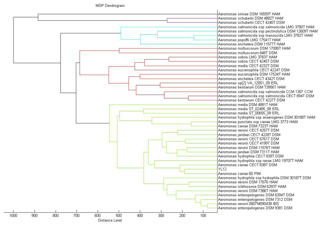 MALDI-TOF mass spectrometry is now routinely used for bacterial identification []. The approach to taxonomic characterization of bacteria using MALDI-TOF-MS is by comparing the ions observed in the resultant spectrum to the MALDI Biotyper database. Dendrogram generated from MALDI-TOF MS based on spectral analysis of strain YL12 along with other Aeromonas spp. within the Bruker database was used to visualise the taxonomic classification of strain YL12. Strain YL12 was observed to match closely to A. caviae 60 PIM. The different colours of the branches represent distinct clusters among the microorganisms in the database.