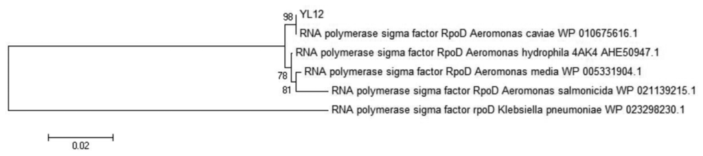 Identification of Aeromonas species had been reported to be a challenging task where several studies have highlighted the limitation of both phenotypic identification method as well as commercial identification systems in identification of aeromonads till the species level, particularly in the environmental isolates [–]. In view of this problem, molecular approaches had become the preferred tool to perform species identification of the aeromonads. RpoD gene, the single-copy housekeeping gene which encodes the sigma70 factor, was demonstrated in several literatures to be a better molecular marker to be used in the study of phylogenetic and taxonomic relationships [–]. The deduced RpoD protein sequence (619 amino acids) was used as query sequence to build a phylogenetic tree. Based on the phylogenetic analysis, the closest relative to YL12 was A. caviae with very high bootstrap value (Figure 4). RpoD protein sequence of Klebsiella pneumoniae was used as an outgroup. The optimal tree with the sum of branch length = 0.20177266 was constructed. The percentage of replicate trees in which the associated taxa clustered together in the bootstrap test (out of 1,000 replicates) was shown next to the branches []. The evolutionary distances were computed using the Poisson correction method [] and are in the units of the number of amino acid substitutions per site. The analysis involved 6 amino acid sequences. All positions containing gaps and missing data were eliminated. There were a total of 611 positions in the final dataset. Evolutionary analyses were conducted in MEGA5.2 []. The evolutionary history was inferred using the Neighbor-Joining method [].
