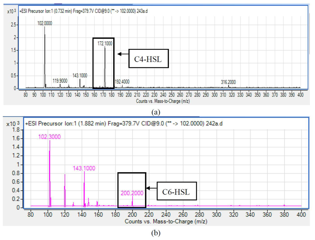 The LC delivery system used was the Agilent 1290 Infinity LC system (Agilent Technologies Inc., Santa Clara, CA, USA) with binary pumps, solvent degasser, thermostated column compartment and diode-array detector, injection volume (2 μL) and the settings used was as described previously [,,]. The column used was an Agilent Zorbax Rapid Resolution High Definition SB-C18 Threaded Column (2.1 mm × 50 mm, 1.8 μm particle size) (Agilent Technologies Inc.). A gradient elution was performed with the mobile phase A being HPLC grade MilliQ water with 0.1% (v/v) formic acid and the mobile phase B being reagent grade acetonitrile added with 0.1 (v/v) formic acid. The gradient profiles used were 80% A and 20% B as the starting mobile phase used for 7 min to proportion of 50% A and 50% B, which continued to 20% A and 20% B at 12 min and progressed to a final proportion of 80% A and 20% B and ran 14 min. The flow rate was set at 0.5 mL/min. Subsequently, Agilent 6490 Triple Quadrupole LC/MS system (Agilent Technologies Inc.) was used to perform high-resolution tandem MS to study the AHL extract [,,]. Electrospray ionization (ESI) was used as the ion source. Precursor ion scanning mode in positive ion mode was used for analysis, where Q1 was set to scan a mass range of m/z 80 to 400 kDa and Q3 was set to monitor for m/z 102, the product ion that indicates presence of lactone ring. Analysis of chromatograms and mass spectra were conducted using the Agilent MassHunter software where the extracted ion chromatogram were compared with reference peaks generated from synthetic AHLs standards.