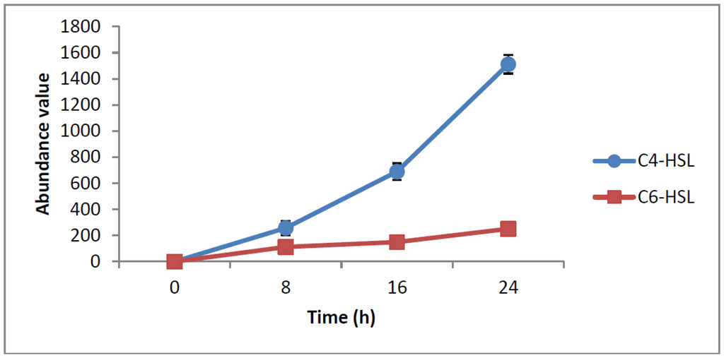 HPLC fractionation followed by MS analysis of the spent culture supernatants extracts of strain YL12 collected were performed to identify the types of AHLs secreted as well as to determine the effect of increased cell density on the accumulated amount of each AHLs produced. All samples were detected to contain two fractions with retention times corresponding to the synthetic C4-HSL (N-butyryl-L-homoserine lactone) and C6-HSL (N-hexanoyl-L-homoserine lactone) (Figure 5). In addition, analysis of the collisionally induced spectra of all the identified fractions demonstrated the presence of the major product ion (m/z value 102) of most AHLs, this detection further affirmed that the fractions detected are AHL molecules (Figure 5). Further, analysis of the abundance value of C4-HSL and C6-HSL detected in each sample showed that the abundance of both AHLs are relatively dependent to the length of incubation period of the respective culture where a longer incubation period coincides with increased abundance of both AHLs. Interestingly, abundance of C4-HSL was shown to increase exponentially from 8 h to 24 h whereas the abundance value of C6-HSL only increased slightly over the same period of time (Figure 6). This finding is in agreement with previously reported studies which demonstrated that C4-HSL is the principal AHL produced in aeromonads, where both LuxI homologue quorum sensing proteins of this species, AhyI and AsaI, were found to produce C4-HSL while C6-HSL is produced in a relatively lower level [,]. The pattern of elevation in amount of C4-HSL correlates with its reported role in regulation of cell-density dependent expression of pathogenesis-related phenotypes in this species such as biofilm production, serine protease and metalloprotease activities [–]. Regulation of the coordinated expression of these virulence factors via QS system is imperative to enhance the pathogenicity of this bacterium by allowing the bacterium to evade host's defense response while mounting effective attacks. Despite the extensive investigation of QS regulated expression of virulence factors in clinical isolates, the role of QS in aeromonads from environmental isolates, particularly from compost, are scarce. Understanding of AHL profile of A. caviae from compost isolates can lead to further inspection of the role of QS in the biology of this bacteria and its interaction with its niche.