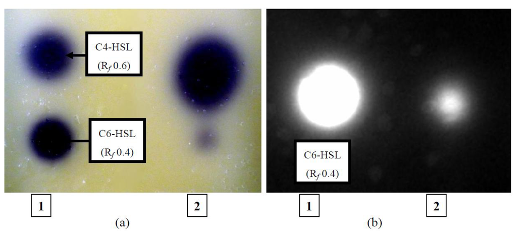 To determine whether AHLs extracted could induce activation of biosensors, bioassay of the AHL extracts were done using C. violaceum CV026 and E. coli [pSB401] used in conjunction with TLC (Figure 7).
