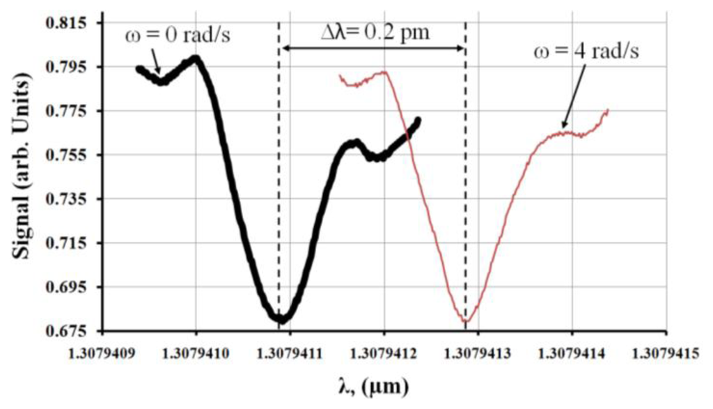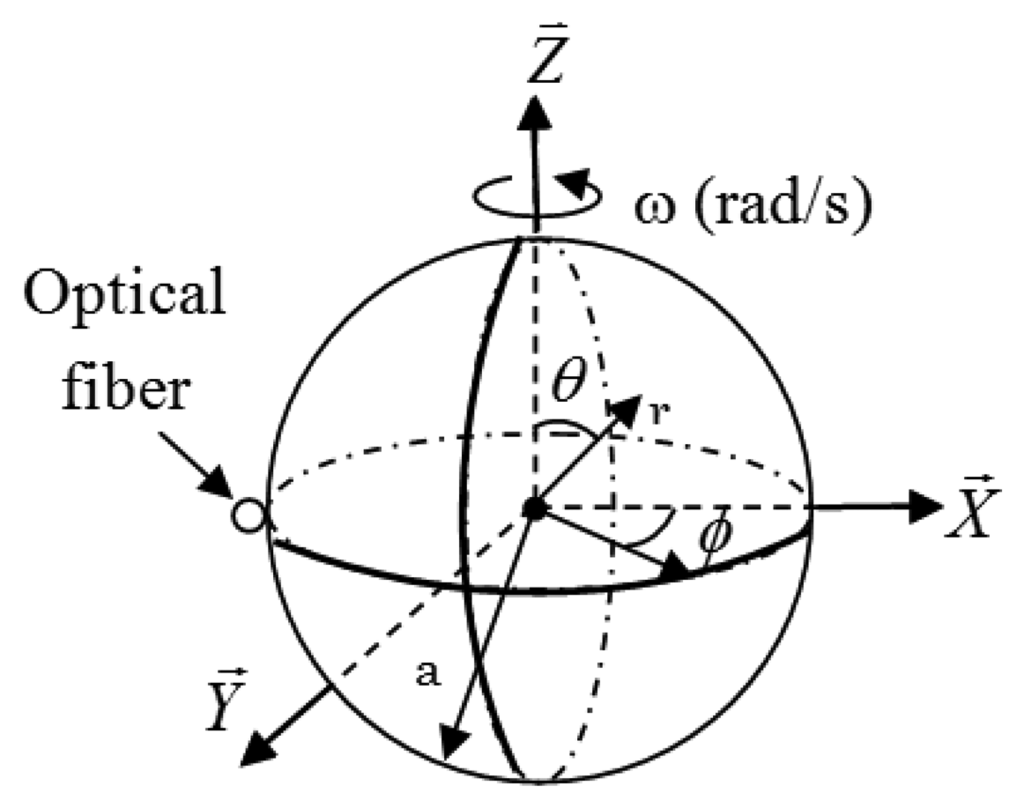 When a microsphere (sensing element) of radius a, and index of refraction n is rotating with an angular velocity ω (see Figure 3), its morphology (shape and index of refraction) is perturbed due to the centrifugal force acting on the resonator. This in turn induces a shift in its optical resonances as described in Equation (1).