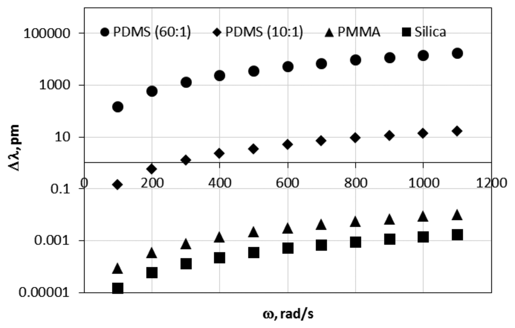 As was expected the MDR shift is directly proportional to the sphere density and also is a quadratic function of the sphere radius and the angular velocity. Figure 4 shows the MDR shifts as a function of the angular velocity for a silica (G = 3 × 1010 GPa, ν = 0.17), polymethylmethacrylate (PMMA, G = 2.6 × 109 GPa, ν = 0.35) polydimethylsiloxane (PDMS 10:1, 10 parts of polymeric base and one part of curing agent by volume, with G = 300 kPa, ν = 0.49) and (PDMS 60:1, 60 parts of polymeric base and one part of curing agent, by volume with G = 1 kPa, ν = 0.49) with a radius of the resonator of 500 μm. As shown in Figure 4, resonators with smaller shear modulus G experience larger MDR shift due to the larger mechanical deformation induced by the applied external angular velocity. Figure 4 also shows that the MDR shifts that are induced in a spinning resonator are very small for silica and PMMA resonators in the range of the calculated angular velocity.