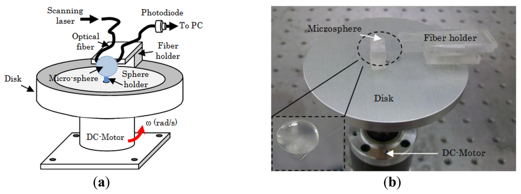 The microsphere was mounted on a metallic disk and attached to it using the silica stem. The metallic disk was mechanically coupled to a DC motor (see Figure 5). The angular velocity of the disk was changed by varying the voltage that was supplied to the DC motor. The MDR shifts were recorded on a PC. During the experiments the temperature was kept constant. The entire experimental setup was mounted on a floating optical table to reduce noise induced by vibrations.