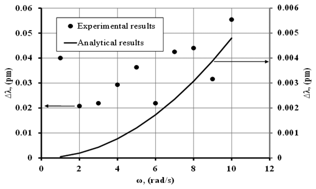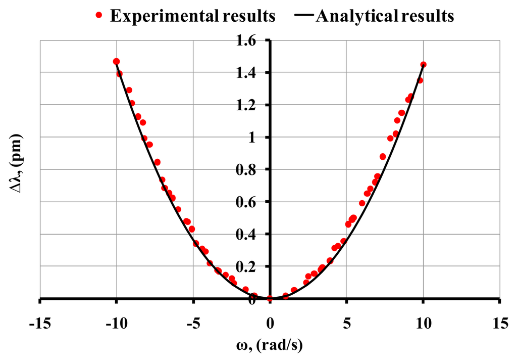 Figure 6 shows the experimental and analytical results predicted by Equation (7) for a microsphere made of (10:1) PDMS with a radius of 500 μm. The optical quality for this resonator was ∼107. As depicted in Figure 6 the (10:1) PDMS microsphere did not show any measurable MDR shift as demonstrated from the scattering of the data points (see Figure 6). Therefore the scatter in the data is an indication of the noise floor (∼0.04 pm) during a typical measurement with ω ≠ 0, that could be caused by vibration, temperature, and coupling fluctuations between the sphere and the tapered section of the optical fiber.