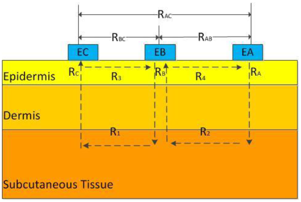 To simplify the analysis, the skin was treated as a pure resistance model. The structure of the three-electrode sensor was shown in Figure 1 (EA, EB, and EC are electrodes A, B, and C, respectively) [16]. The area of skin to be measured was under electrode B. RA, RB, and RC were the longitudinal resistances of the epidermis under electrodes A, B, and C, respectively; R1 and R2 were the resistances of the tissue under the epidermis between electrodes B and C and between electrodes A and B, respectively. R3 and R4 were the resistances of the epidermis between electrodes B and C and between electrodes A and B, respectively. When a voltage was applied between two electrodes, the main path of the current originated from one electrode, penetrated the epidermis, was transmitted to the deep tissue, and reached the other electrode by penetrating the epidermis again. Then, the following relations were established: