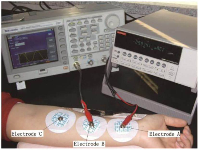 The skin resistance measuring system was shown in Figure 2. An alternating voltage (100 mV, 10 Hz) was generated from a signal source. Two single-pole double-throw (SPDT) switches were applied for two of the three electrodes. The weak current flowing through the skin between each of the two electrodes was measured using a picoammeter. The resistance between the two electrodes was obtained using Ohm's law. Disposable electrocardiography (ECG) electrodes were used for electrodes A and C. A disposable ECG electrode or an Ag-AgCl disc electrode was used for electrode B.
