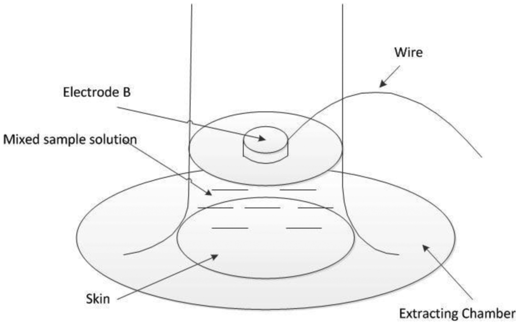 Dynamic skin resistance measurement referred to the measurement of skin resistance during the extraction process. Electrodes A and C were set as the static mode. Because the extraction chamber was small, the ECG electrode cannot fit into the chamber. An Ag/AgCl disc electrode was chosen as electrode B, which was placed in the extraction chamber facing down and immersed in the diluted ISF. Then, the current can be transmitted through electrode B and the sample solution into the skin. The wire connected to electrode B was led out of the chamber through a sealed hole on the wall of the chamber (Figure 4). To obtain the longitudinal skin resistance under electrode B, the resistances between A and B, between B and C, and between A and C were measured. During the extraction process, skin resistance was measured for five times with the same time interval (2 min). The average of the five values was considered the dynamic skin resistance of this extraction process.
