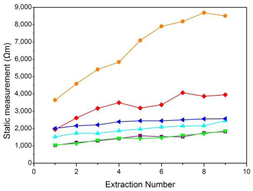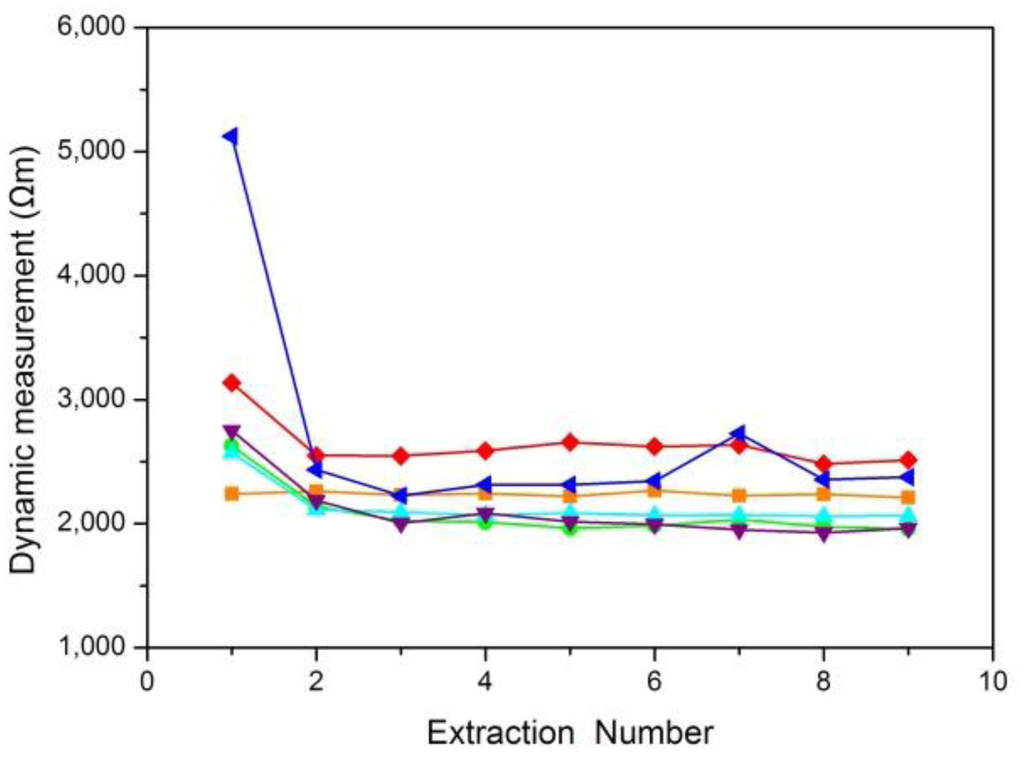 Figure 5 shows that the results of static skin resistance measurements between groups were quite different. Due to the recovery of the skin, the static resistance values in the same group were varied. However, the orange curve of Figure 5 had a relatively large range of variation, which should be considered the gross error. Compared with static skin resistance measurements, the results of dynamic skin resistance measurements (Figure 6) had little difference between groups. The dynamic resistance values in the same group reached a stable level within a short time. This process was generally accomplished during the first extraction. The cause of the great differences between the two measuring methods included the change in the skin state during the measuring process, the distinction between electrode B for the two modes, and the proportion of epidermal resistance in the acquired values.