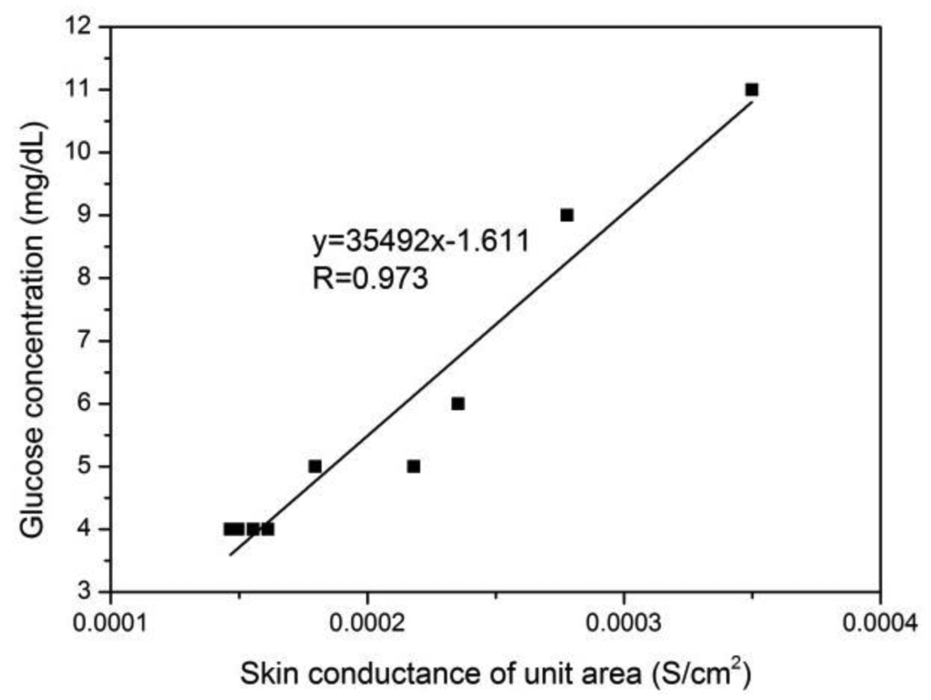 Thus, a quantitative relationship between the volume of transdermally extracted ISF and the conductance or resistance of skin was established. By substituting this relation into Equation (3), the blood glucose prediction is achieved as follows: