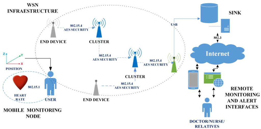 The mobile monitoring node receives, processes and forwards the data pertaining to tachycardia, bradycardia and falls throughout the networks. The WSN Infrastructure consists of a group of nodes placed throughout the home. These nodes are capable of establishing a hierarchical network, receiving information from the mobile nodes and routing the information to a computer with reduced computational capabilities and an 802.15.4 radio. The SINK is a computational device that picks up and stores the information it receives from the WSN infrastructure, permitting either local or remote access to the data. Finally, the Remote Monitoring and Alert Interface is an application to serve mobile devices and a standard website, both of which can receive notifications of important events and consult the patient's history and other personal information.