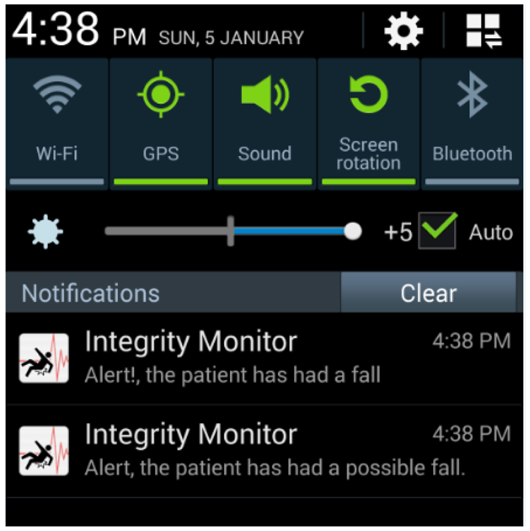 For each possible fall, alerts were generated and delivered to the caregivers by means of the application we developed for mobile devices, via push notifications. Figure 10 illustrates the mobile device interface.