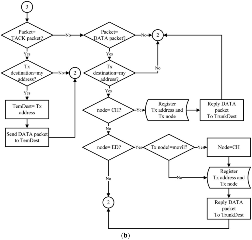 The routing of DATA packets is carried out by a hybrid mechanism. A mobile node must first reactively identify its destination by broadcasting a TOKEN packet. Only upon receiving a (TACK) unicast reply from a network node will the mobile node send a return DATA package. Importantly, the DATA routing in infrastructure nodes is proactive because each node knows its route by default because the information is kept and actualized in its routing table. Figure 4 illustrates the proposed routing protocol for WSN.