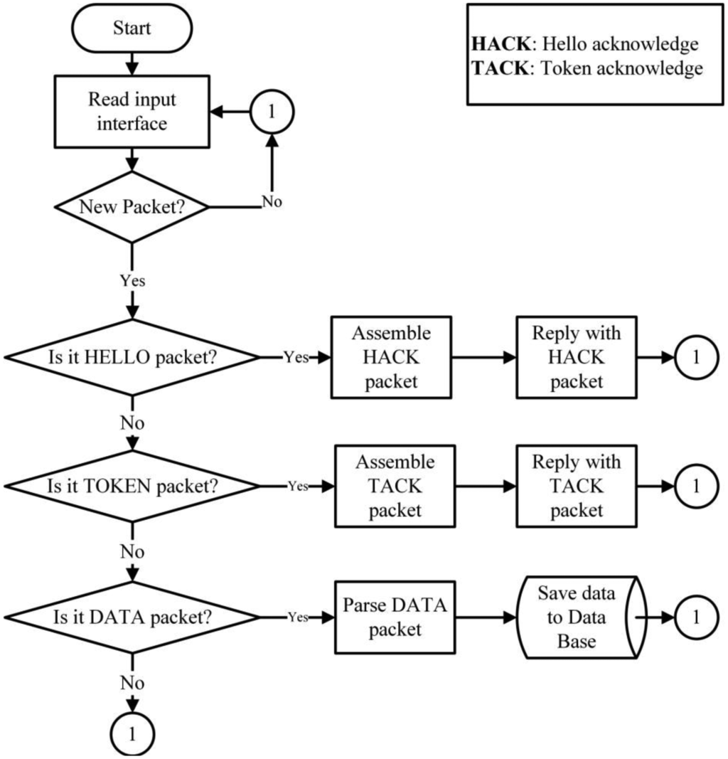 The SINK is comprised of electronic devices that have a greater processing capacity than the rest of the devices of the WSN Infrastructure, because it is where all the information compiled by the WSN is sent [30]. The SINK not only collects data, but communicates it through the Internet to the application that controls the database. The behavior of the data collector is shown in Figure 5. The behavior of the SINK is completely reactive as it waits for the arrival of any packet to be processed. When a new package is received, the type of packet must be analyzed. If it is a HELLO packet, the SINK creates a reply HACK packet, which contains information about the packet type, its origin (SINK ID), its destination (obtained from the transmitting node) and its role (role of the SINK). If the SINK receives a TOKEN packet, it sends a TACK packet to the transmitting node. If the SINK receives a DATA packet, it analyzes and classifies the packet content in order to store it in its database.