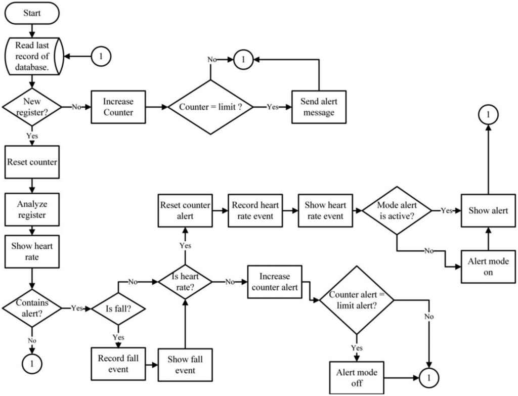 Besides the alerts mentioned previously, the system also sends alerts relative to situations that may place the user's physical integrity, making it possible to notify those who are concerned for the patient's wellbeing about a potential fall or a bradycardia or tachycardia event. The alerts are generated upon analyzing any new entries received and recorded in the database. After receiving a new entry, the application analyzes it and validates the type of registry (fall or heart rate). Upon determining the type of registry, the alert counter resets, activating the alert mode and displaying the existing alert on the mobile device or Web page. After resetting, if there are no new entries registered in the database, the alert counter increases. Once the counter increases, the application compares the alert counter with the pre-established counter limits. If the entries surpass the alert counter limits, the alert mode is deactivated. This is an important safety measure as it prevents repeated and unnecessary alerts, or prolonged periods of system alerts.