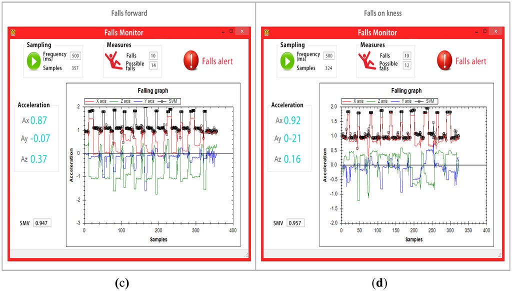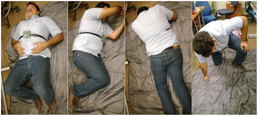 A total of 40 falls were carried out to validate the fall detection algorithm. The 40 falls were equally represented by 10 falls backwards, 10 falls forward, 10 falls to each side (five falls to the left and five falls to the right) and 10 falls to the knees, as shown in Figure 7.